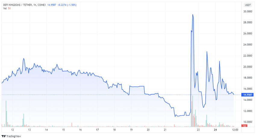 Dlatego więc JEWEL jest zarówno walutą w grze, jak i kryptowalutą handlową, z maksymalną podażą 500 milionów JEWEL. Od bohaterów i zwierząt domowych po działki, można kupić za nie wszystko, a część wpływów trafia do deweloperów. Cena ATH tokena wynosiła $23,36 w dniu 5 stycznia 2022. Dostępny jest na giełdzie Hotbit, MEXC i na wewnętrznym rynku gry DeFi Kingdoms.