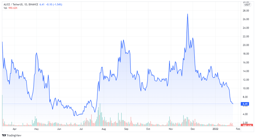 Podobnie, zabezpieczenie NFT oznacza, że zakupione NFT mogą zostać odsprzedane za cenę równą zablokowanemu zabezpieczeniu, podczas gdy same NFT ulegają zniszczeniu. Według Etherscan, maksymalna podaż tokenów ALICE wynosi 92 miliony monet, które są już w posiadaniu 5 257 użytkowników. Od czasu swojej ceny ATH wynoszącej 42,55 USD w marcu 2021 roku, ALICE miał swoje wzloty i upadki, czekając na pełną premierę.