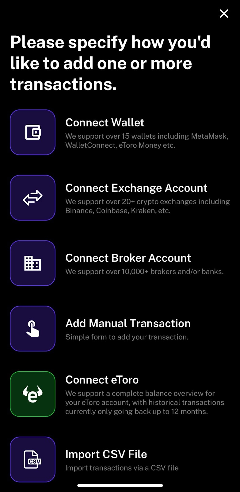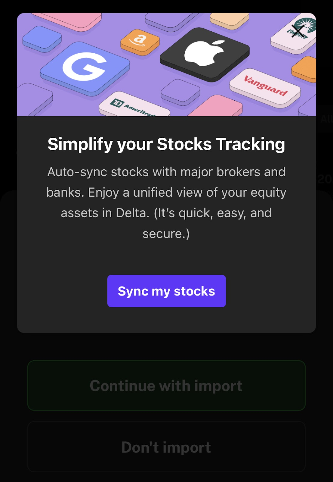 W przypadku Delta, jeśli zarejestrowałeś się za pomocą konta eToro, możesz zaimportować swoje zasoby eToro. W aplikacji mobilnej Delta można wybrać następujące opcje importu: