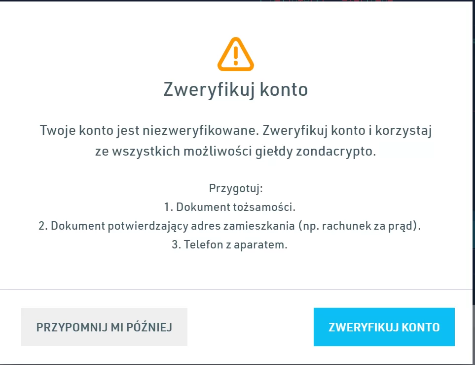 Krok 4: Ostatni etap to weryfikacja. Wyślij do Zonda zdjęcie dokumentu tożsamości (np. dowód osobisty, paszport) i selfie. Aby wypłacać środki, potrzebne jest potwierdzenie adresu.