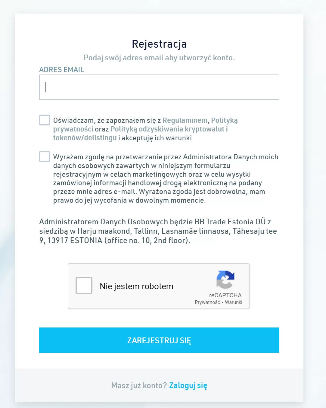 Krok 2: Wprowadź swój adres email, zaakceptuj regulamin i politykę prywatności. Wypełnij kod CAPTCHA i kliknij ‘Zarejestruj się’.