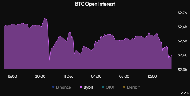 Otwarte pozycje (open interest) Bitcoina wynosiło około 12 miliardów dolarów na wszystkich giełdach od 11 grudnia. OI jest miarą wartości nominalnej instrumentów pochodnych BTC, które nie zostały jeszcze rozliczone lub wygasły.