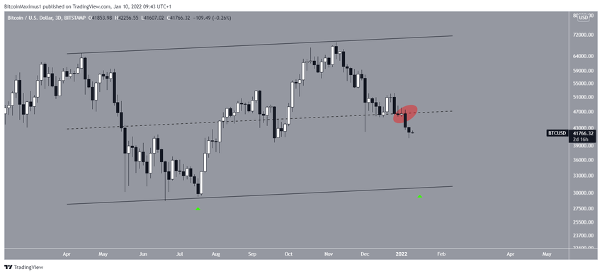 Trader kryptowalutowy @TheTradingHubb zamieścił na Twitterze wykres BTC. Stwierdził on, że cena jest pogrążona w korekcie od czasu osiągnięcia ATH w listopadzie 2021 r.