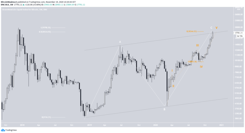 Cena Bitcoina (BTC) prawdopodobnie rozpoczęła zwyżkową formację pięciofalową (pomarańczowa) po osiągnięciu dołka w dniu 13 marca. Cena może znajdować się w piątej i ostatniej fali impulsu, który jest częścią długoterminowej fali cyklu C (biała).