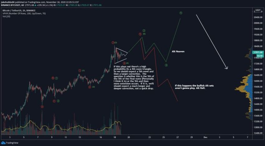 Jeśli to prawda, to następny wzrost może doprowadzić cenę do 20 000 USD, jak opisano w pierwszej sekcji. Spadek poniżej 17 283 USD (czerwona linia) unieważniłby tę możliwość.