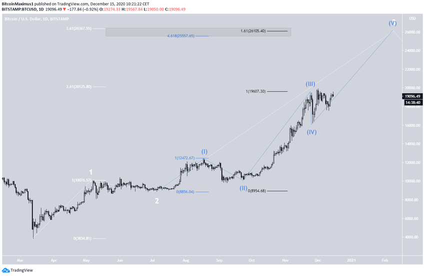 Najbardziej prawdopodobny region zakończenia piątej fali (niebieskiej) znajduje się w przedziale od 25 500 do 26 300 USD. Obszar można znaleźć za pomocą kombinacji rozszerzeń Fib: