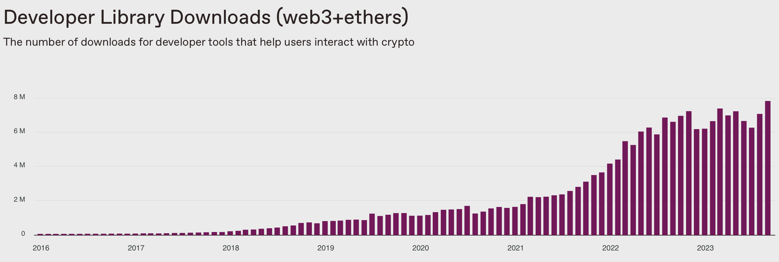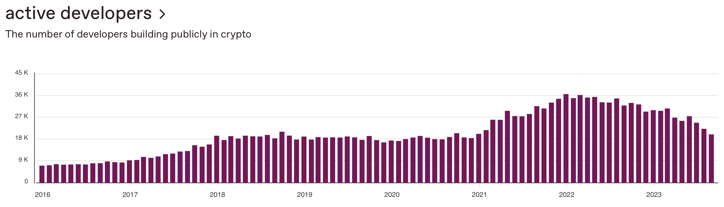 Dynamikę liczby aktywnych deweloperów w kryptowalutach można ocenić na poniższym wykresie, opracowanym przez ekspertów a16z. Jak widać, obecny wynik jest porównywalny ze wskaźnikiem sprzed prawie trzech lat, kiedy to w branży aktywów cyfrowych rozpoczęła się hossa.