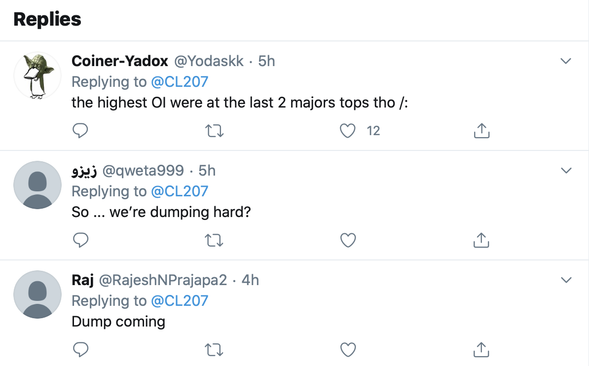 Na pierwszy rzut oka wzrost zainteresowania otwartymi pozycjami jest pozytywnym wskaźnikiem. Oznacza to, że rynki futures i zaufanie do Bitcoina znów nabierają tempa. Jednak może nie być tak, jak się wydaje. Jak zauważa Coiner-Yadox (@Yodaskk), ostatnie nowe maksima dla otwartych pozycji zdarzyły się wtedy, gdy cena BTC gwałtowenie wzrosła. Inni są również przekonani, że po tym nadchodzi mocny spadek.