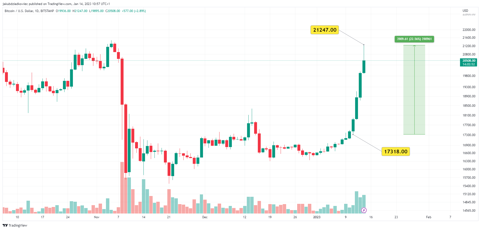 W trakcie ostatnich 4 dni – od 11 do 14 stycznia – Bitcoin wzrósł z dołka na poziomie 17 318 USD do szczytu na 21 247 USD. Oznacza to wzrost o 22,5%. Również większość altocinów odnotowuje w tym tygodniu dwucyfrowe zyski. Łączna kapitalizacja rynku kryptowalut wróciła powyżej poziomu 1 bln USD, według danych od CoinGecko.