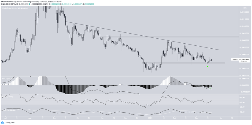 LINK/BTC podąża za opadającą linią oporu od początku września 2020 r. Do tej pory wykonał pięć nieudanych prób wybicia.