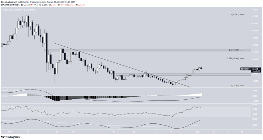 Po dwóch kolejnych odbiciach od linii wsparcia trójkąta i obszaru wsparcia 13 USD, LINK wyłamał się z tego schematu w dniu 30 lipca i od tego czasu porusza się w górę.