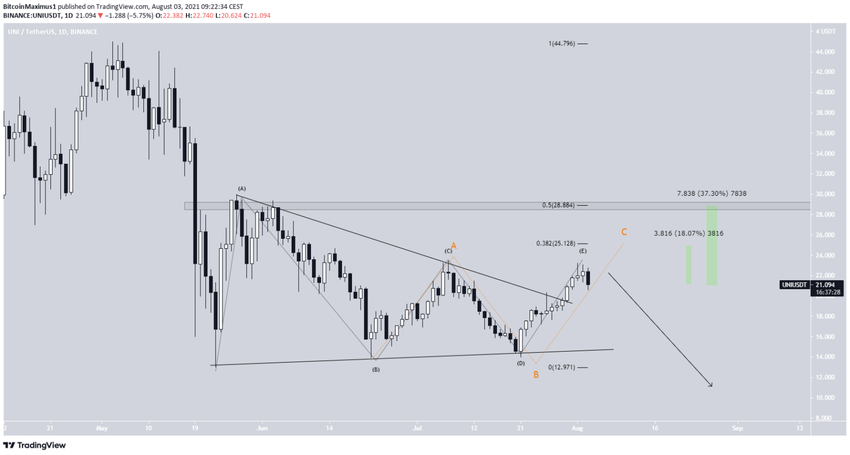 Z drugiej strony, możliwe jest, że UNI znajduje się w strukturze korekcyjnej A-B-C (pomarańczowy), która zakończyłaby się w pobliżu obszaru oporu 25,12 USD, co oznacza wzrost o 18% w stosunku do obecnej ceny.