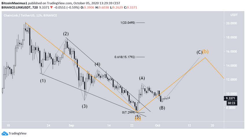 Ponieważ spadek rozpoczął się po szczycie z dnia 17 sierpnia, to wydaje się, że LINK zakończył wzorzec niedźwiedziego impulsu, który przybrał formę wiodącej przekątnej (pokazanej na czarno poniżej). Mogła to być fala A korekty A-B-C (na pomarańczowo poniżej), która ostatecznie doprowadziłaby do kolejnego niższego dołka.