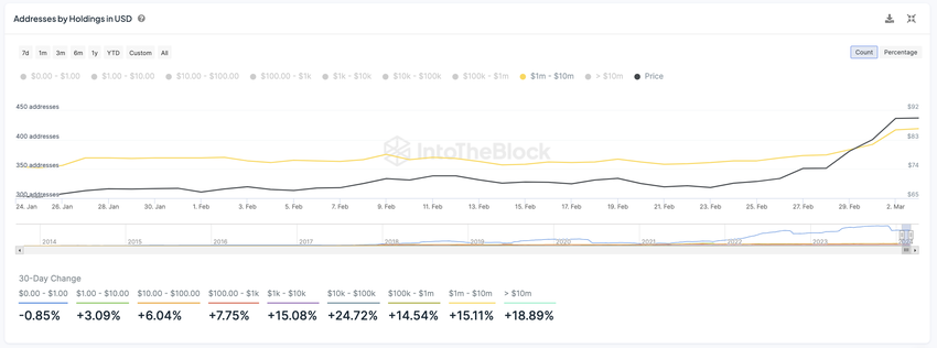 W ciągu ostatnich 30 dni liczba adresów posiadających od 1 mln USD do 10 mln USD w LTC wzrosła o 15%. Natomiast tylko w ciągu ostatniego tygodnia grupa ta powiększyła się o 86%. Wzrosła z 364 do 419 adresów w okresie 30 dni.