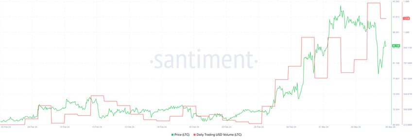 Gwałtowny wzrost dziennego wolumenu obrotu Litecoina, kluczowego wskaźnika mierzącego zainteresowanie inwestorów i płynność rynku, przyciągnął uwagę rynku. Wolumen wzrósł z 391 mln USD 20 lutego do 1,3 mld USD 5 marca, co stanowi oszałamiający wzrost o 232,48%.