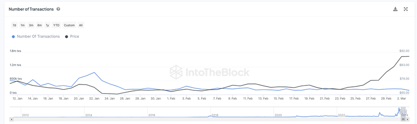 Sponsored SponsoredCena LTC wzrosła z 68,30 USD 23 lutego do 94 USD 2 marca, co oznacza wzrost o 38% w mniej niż 10 dni. Jednak liczba transakcji stała się dość stabilna w tym samym okresie, zawsze około 230 000 transakcji dziennie.