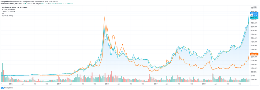 Podczas gdy Bitcoin odnotowuje spektakularne wzrosty, Litecoin trzyma się tuż za jego plecami, prawie jak w zegarku. Trend LTC w zasadzie pozostawał w cieniu BTC. Jednak LTC osiągnął lepsze wyniki niż BTC w ciągu ostatnich kilku dni, nawet pomimo znacznego wzrostu BTC.