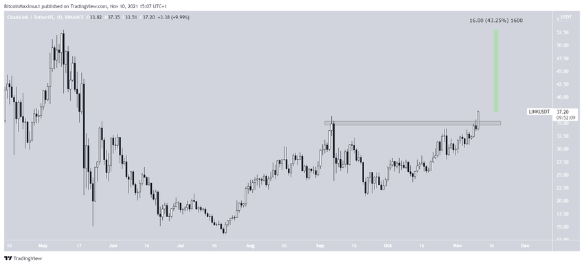 Chainlink (LINK) rośnie od 21 września. Obecnie jest w trakcie przebijania się powyżej horyzontalnego obszaru oporu 35 USD, który jest tworzony przez maksima z września.