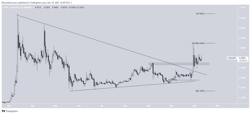 Chiliz (CHZ) rośnie od czasu wybicia z trójkąta symetrycznego 30 października. Ruch w górę doprowadził do osiągnięcia wysokiego poziomu 0,656 USD tego samego dnia.