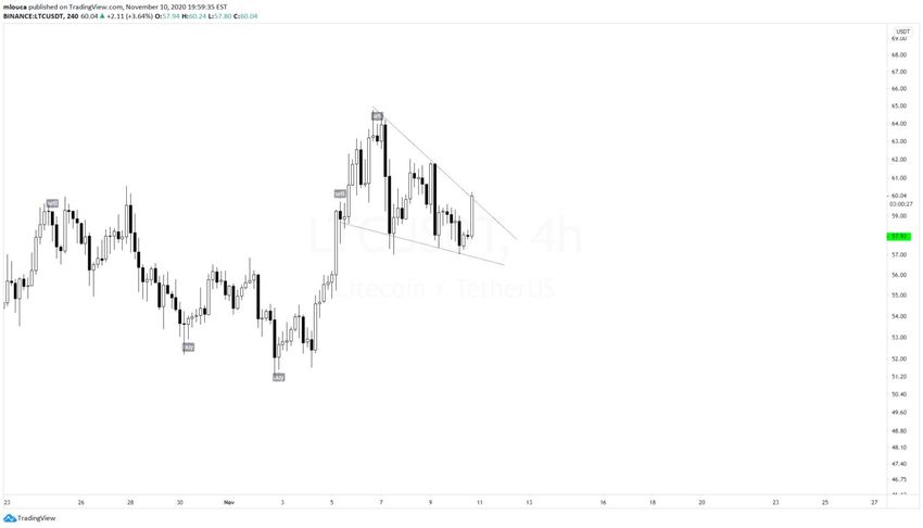 Jednak bliższe spojrzenie wydaje się pokazać notowania LTC wewnątrz czegoś, co przypomina opadający trójkąt zamiast klina.