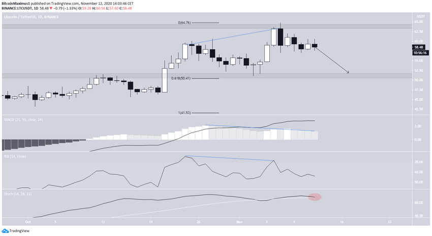 Cena Litecoina (LTC) spadała od czasu jej odrzucenia w obszarze oporu na 63 USD w dniu 7 listopada. Powinna on teraz wznowić ruch w dół w kierunku najbliższego obszaru wsparcia.