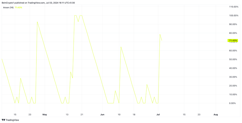 Rosnąca linia wskaźnika Aroon Up Line dla LTC potwierdza siłę obecnego trendu wzrostowego. Aktualnie wartość tego indykatora wynosi 71,43%.