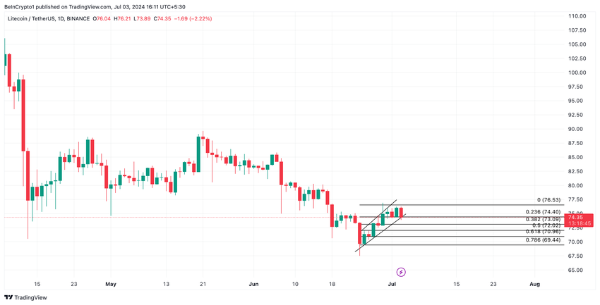Jeśli trend wzrostowy będzie kontynuowany, cena LTC może wzrosnąć do 74,40 USD.