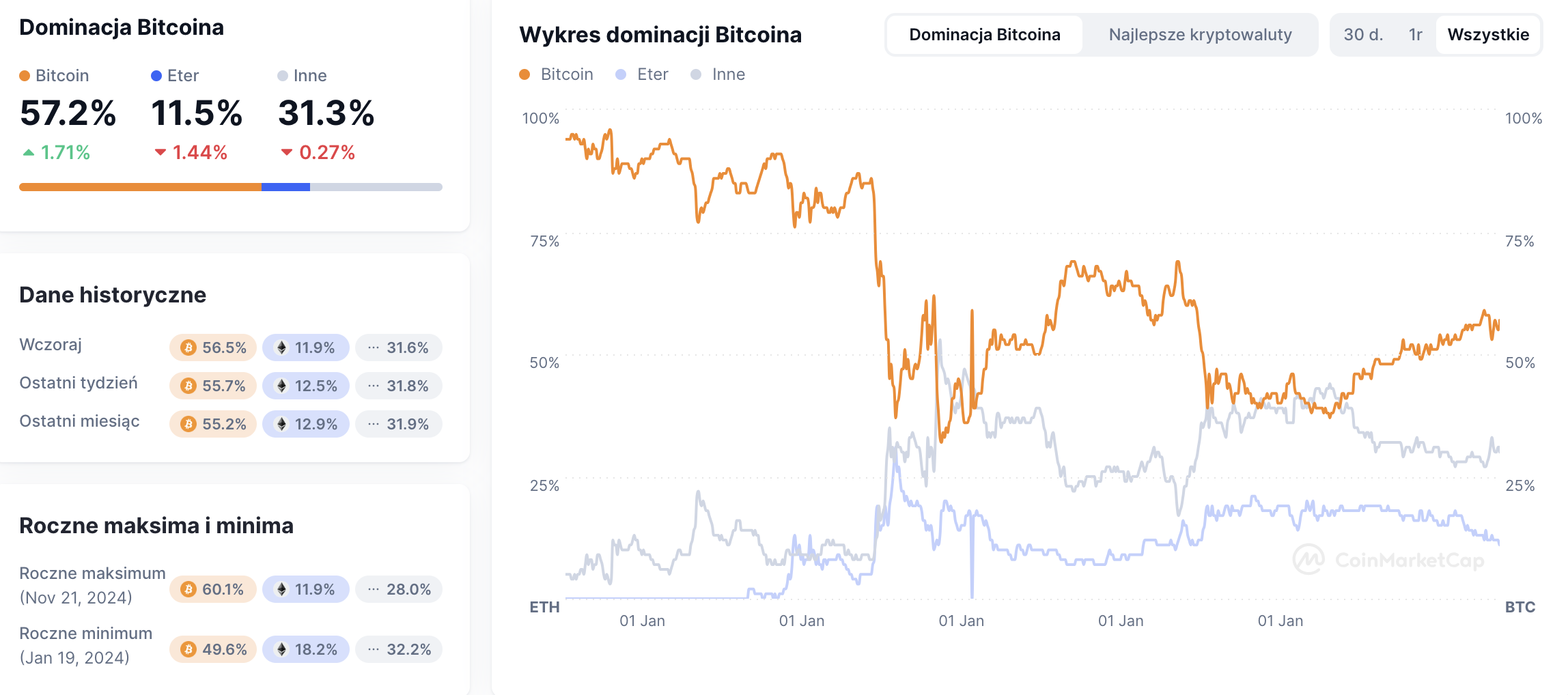 Wskaźnik dominacji Bitcoina, mierzący jego udział w kapitalizacji całego rynku kryptowalut, wzrósł do 54,8%. Natomiast dominacja Ethereum spadła do 11,3%. Wzrost ten wskazuje na preferencję inwestorów dla Bitcoina w trudnych warunkach rynkowych.