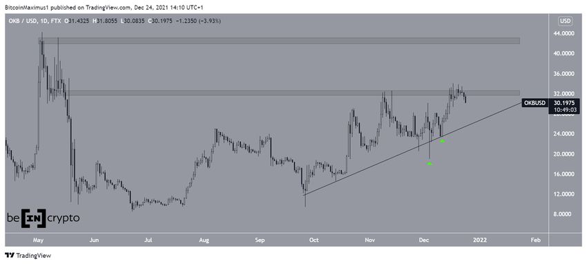 Następnie kryptowaluta wznowiła ruch w górę i obecnie próbuje wybić się ponad horyzontalny obszar oporu 32 USD. Powyżej tego poziomu nie handlowano od maja.