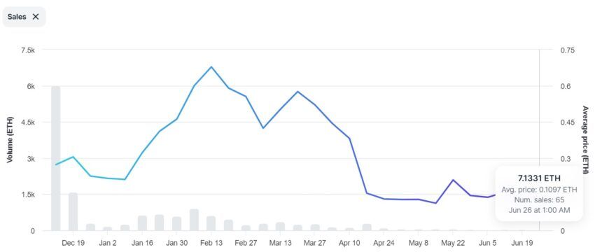Warto jednak zauważyć, że w ciągu ostatniego tygodnia kolekcja odnotowała spadek sprzedaży, sprzedając tylko 100 NFT. Oznacza to spadek o ponad 50% w porównaniu z poprzednimi okresami.