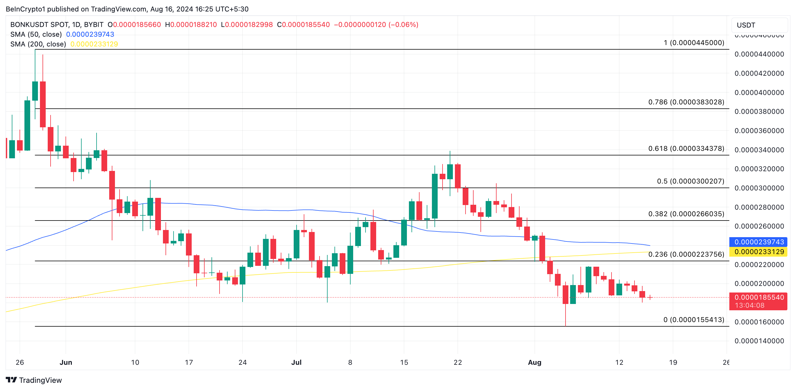 Analiza jednodniowego wykresu BONK ujawnia potencjalne tworzenie się “krzyża śmierci”, gdzie 50-dniowa prosta średnia ruchoma (SMA) (niebieska linia) zbliża się do przecięcia poniżej 200-dniowej SMA (żółta linia).