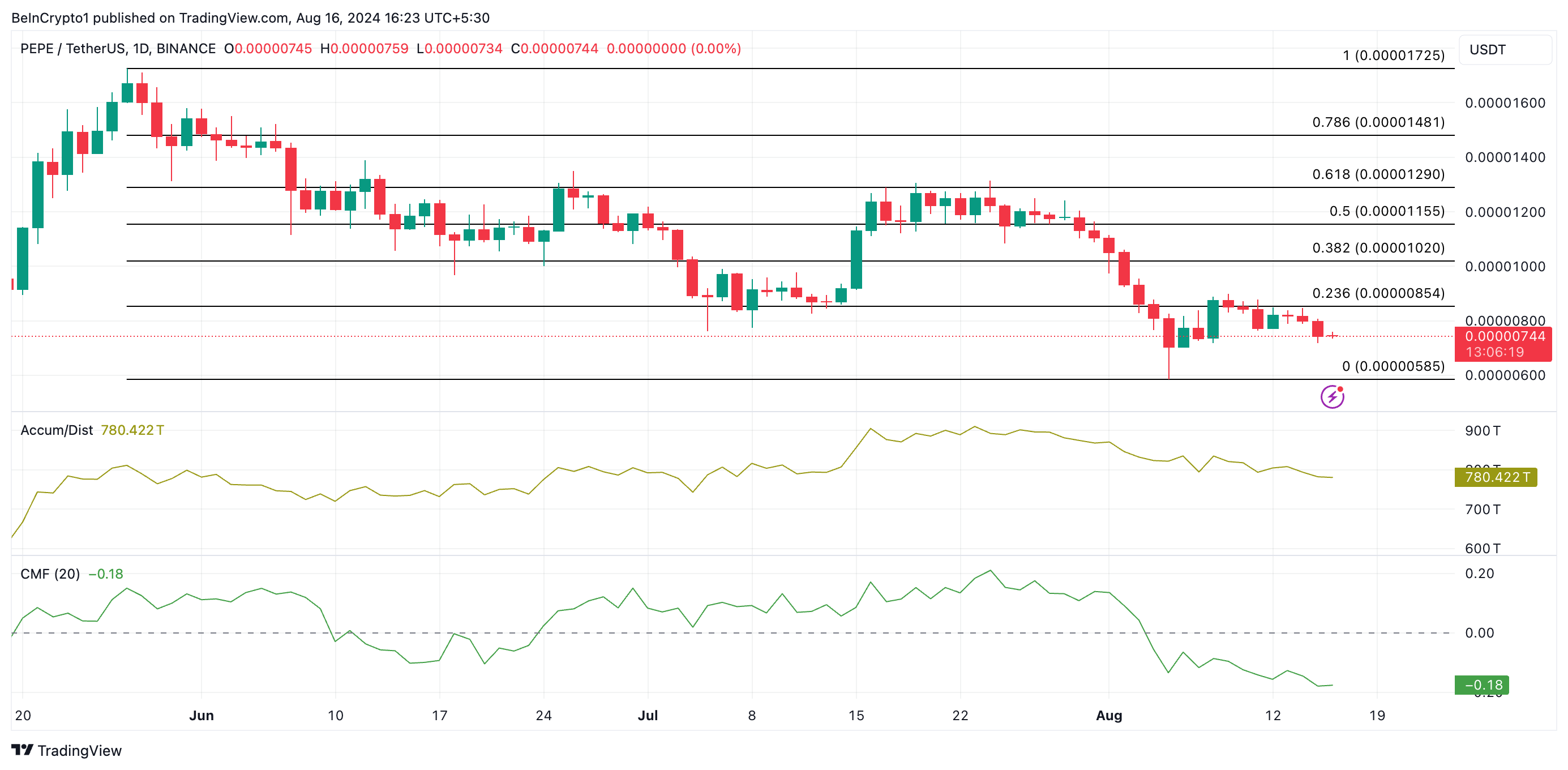 Dodatkowo, spadający wskaźnik przepływu pieniędzy Chaikin (CMF) PEPE, obecnie na poziomie -0,18 i poniżej zera, również się obniża. Spadająca cena w połączeniu ze spadającym CMF potwierdza wzrost presji sprzedaży, co wskazuje, że więcej traderów sprzedaje PEPE niż je akumuluje.