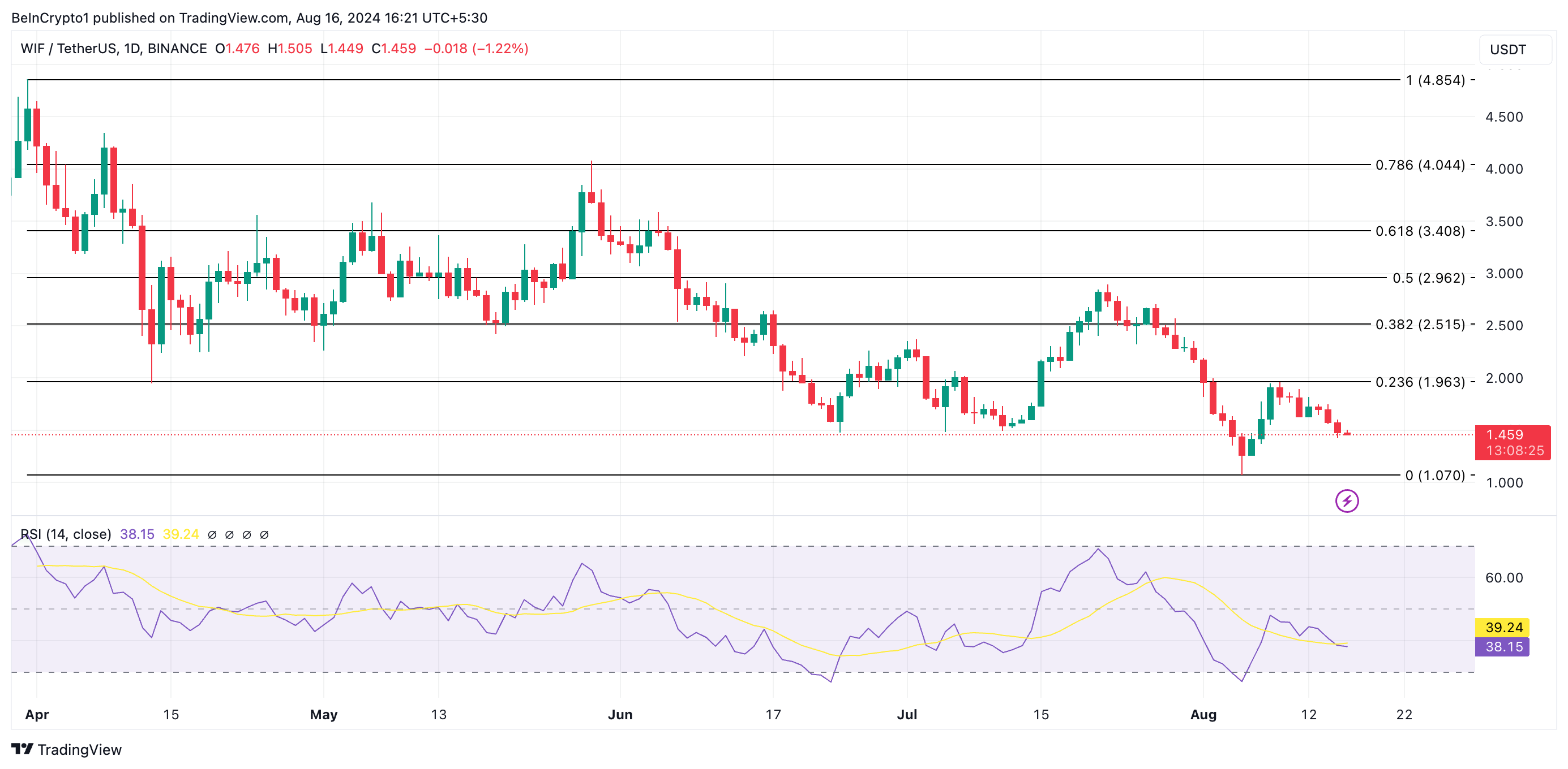 Na rynku spot popyt na WIF również znacznie spadł. Jego wskaźnik siły względnej (RSI) obniżył się i wynosi obecnie 38,22, co wskazuje, że presja sprzedaży jest obecnie silniejsza niż akumulacja tokenów.