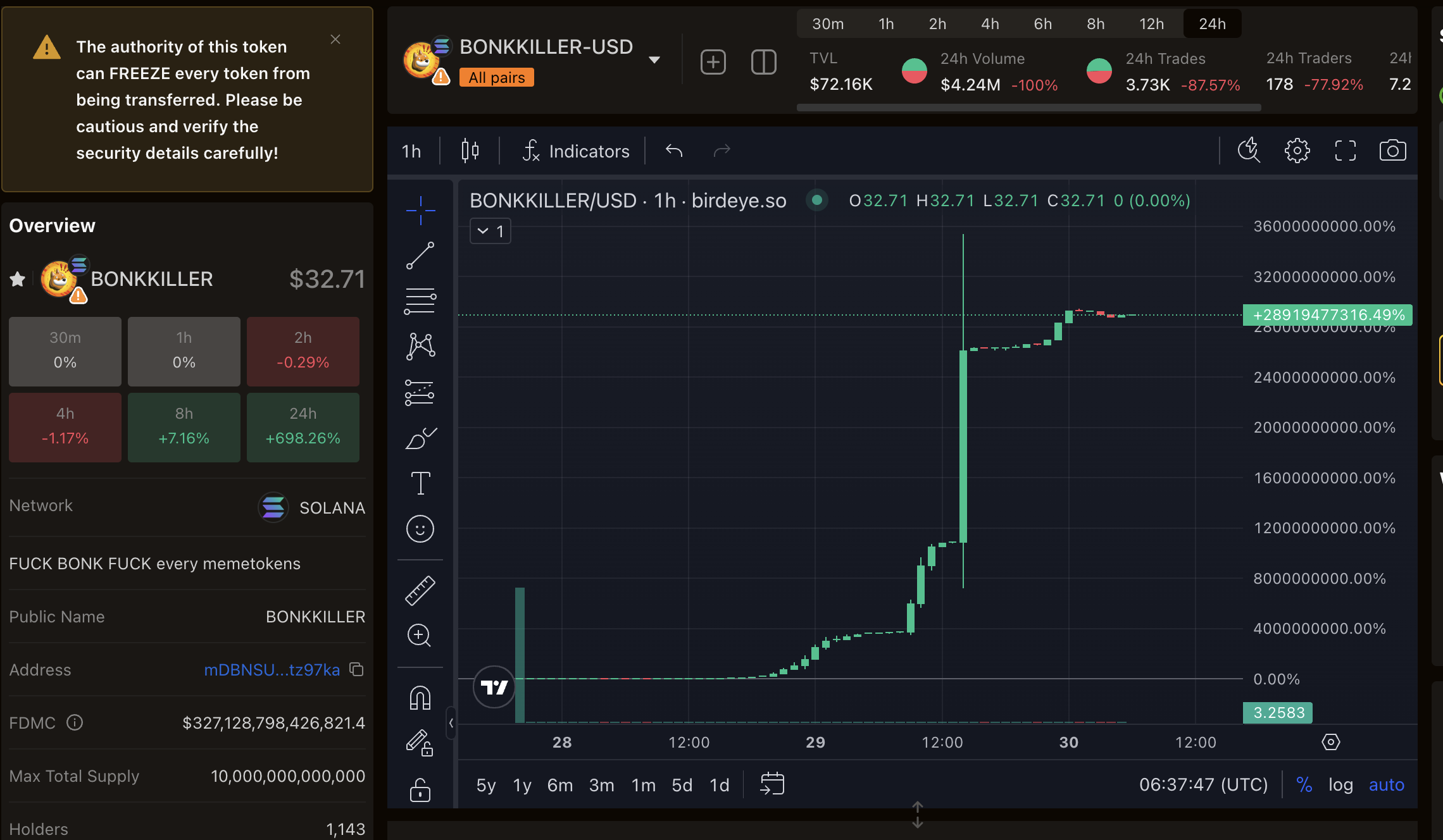 Pomimo tego, że moneta ma tylko ponad 1143 posiadaczy, w ciągu 24 godzin odnotowała około 4,24 mln USD wolumenu obrotu. Według platformy analizy kryptowalut Birdeye, ponad 90% tokenów jest kontrolowanych przez jego twórcę. Co więcej, funkcja “zamrożenia” uniemożliwia posiadaczom sprzedaż swoich aktywów, skutecznie zamrażając ich inwestycje.
