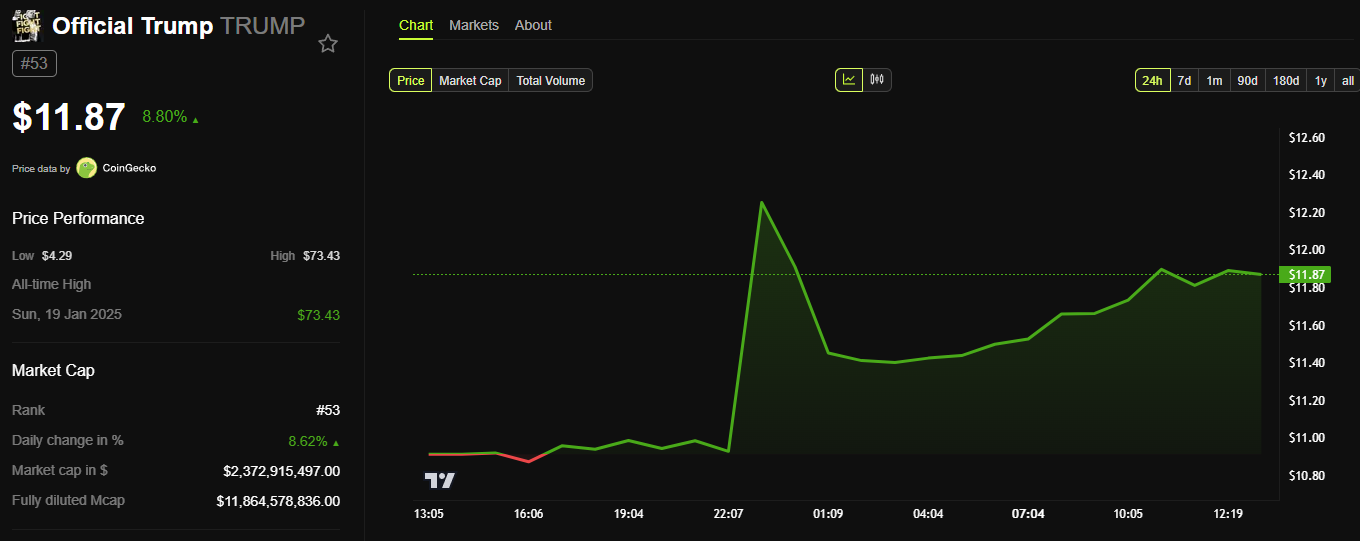 Prezydent Donald Trump uruchomił token TRUMP w dniu 17 stycznia 2025 roku. Początkowo przyciągnął uwagę społeczności kryptowalutowej, osiągając szczyt swojej kapitalizacji rynkowej na poziomie 15 mld USD zaledwie dwa dni po uruchomieniu.