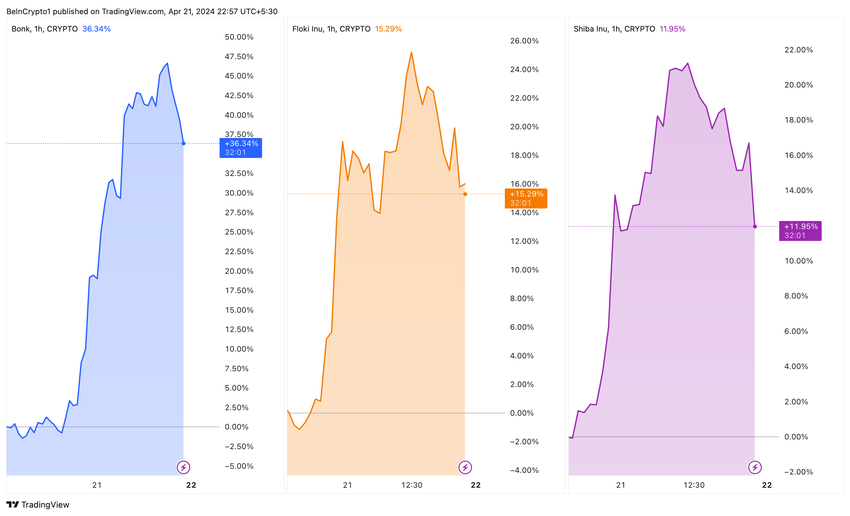 Oparty na Solana memecoin BONK był liderem tego trendu z imponującym wzrostem o 46%, osiągając cenę 0,000022 USD. Oznacza to znaczące ożywienie dla BONK, który odnotował znaczny spadek wcześniej w kwietniu.