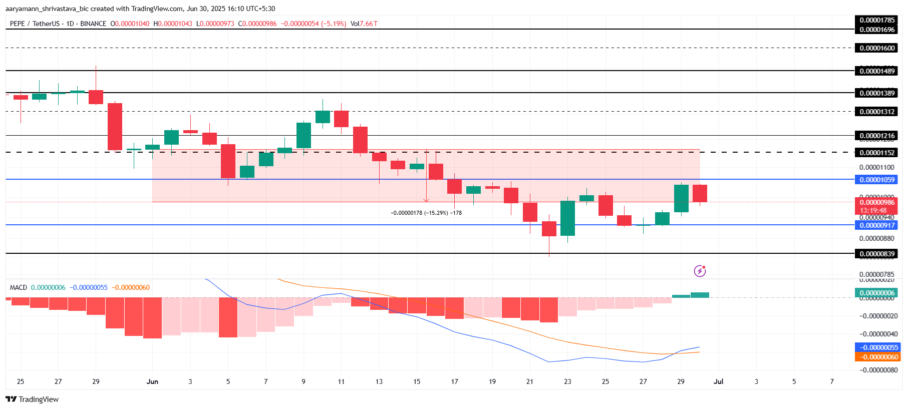 Tymczasem wskaźnik MACD pokazuje pierwsze bycze przecięcie w tym miesiącu, sygnalizując potencjalną zmianę impetu dla PEPE. To może pomóc tokenowi odzyskać straty i dążyć do poziomu oporu wynoszącego 0,00001216 USD. Wzrost powyżej tego punktu wskazywałby na dalszy ruch w górę w nadchodzących tygodniach.