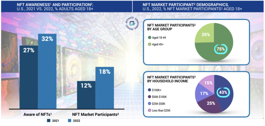 Liczba uczestników ze Stanów Zjednoczonych wzrosła z 12% w 2021 r. do 18% w 2022 r. Mimo to mniej niż jedna trzecia populacji USA wciąż nie wie, czym są NFT. Czterdzieści trzy procent uczestników NFT pochodziło z zamożnych gospodarstw domowych o dochodach 100 000 USD lub więcej.