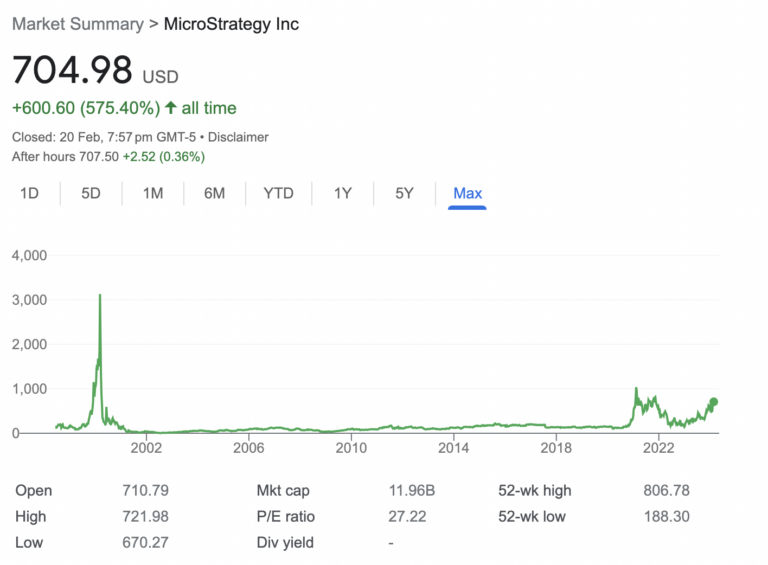Przez lata akcje MicroStrategy nie radziły sobie dobrze. Wszystko zmieniło się po tym, jak firma zdecydowała się całkowicie skupić na Bitcoinie. W sumie ma teraz 190 000 Bitcoinów zakupionych za łączną kwotę 5,93 miliarda dolarów.
