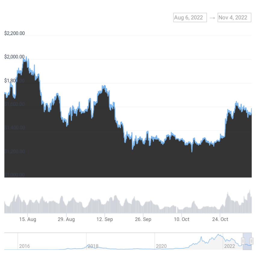 W chwili pisania tego tekstu Ethereum jest obecnie notowane na płaskim poziomie 1 549 dolarów. Ponadto, jak dotąd w tym miesiącu znajduje się w trendzie spadkowym.