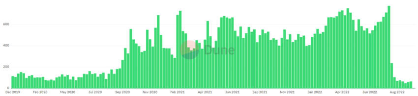 Tornado Cash odnotowuje znaczny spadek aktywności w wyniku sankcji nałożonych przez Skarb Stanów Zjednoczonych. Dane z Dune pokazują znaczny spadek unikalnych użytkowników tygodniowo od ogłoszenia sankcji w sierpniu 2022 roku, a we wrześniu unikalni użytkownicy znaleźli się znacznie poniżej 100.
