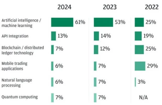Na pytanie, które technologie będą miały największy wpływ na handel w ciągu najbliższych trzech lat, respondenci mówili głównie o AI uczeniu maszynowym. Kategorię tę poparło 61 procent ankietowanych, co stanowi wzrost z 53 procent w ubiegłym roku.