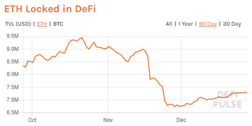 SponsoredEthereum TVL to 7,3 miliona ETH według DeFi Pulse. Liczba ta spadła o 23% z rekordowego poziomu 9,5 mln ETH zablokowanego pod koniec października.