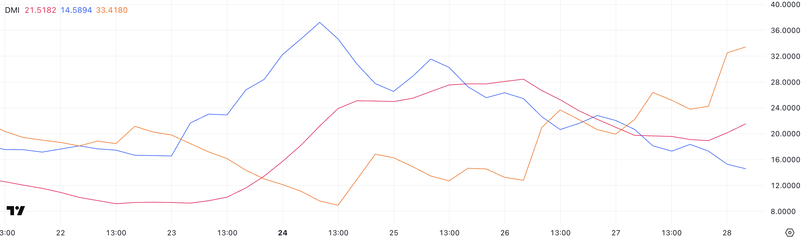Wykres DMI (Directional Movement Index) dla Bitcoina obecnie pokazuje ADX na poziomie 21,51, co wskazuje na osłabienie siły trendu.