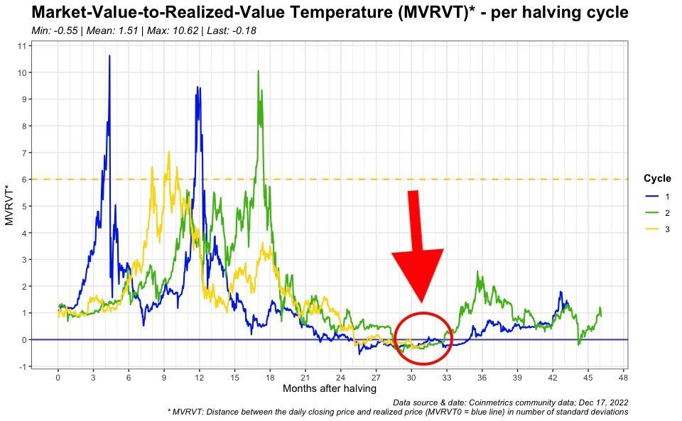 Innym sposobem porównania aktualnego rynku niedźwiedzia z jego historycznymi odpowiednikami jest naniesienie na siebie wykresów wskaźnika MVRVT każdorazowo zaczynając od daty halvingu. W ten sposób @dilutionproof przedstawił porównanie 3 post-halvingowych cykli Bitcoina.