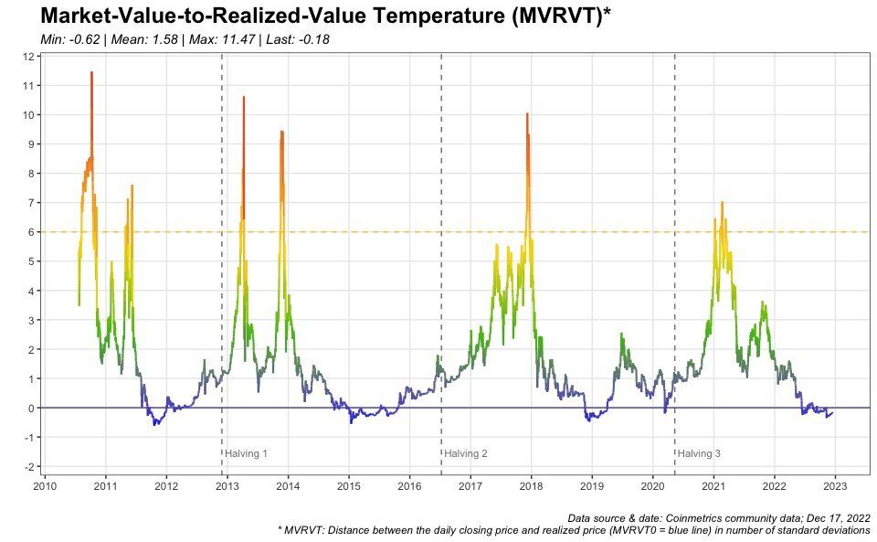 Natomiast, gdy MVRVT spadał poniżej poziomu 0, kolory stawały się coraz zimniejsze w kierunku niebieskiego. Działo się to na końcu każdego rynku niedźwiedzia w latach 2011, 2015, 2018. Ponadto stało się tak na krótko w trakcie krachu COVID-19 w marcu 2020 roku. Również poziomy osiągane aktualnie od czerwca 2022 roku odpowiadają niebieskiej barwie, która sygnalizuje ekstremalne ochłodzenie rynku Bitcoina.