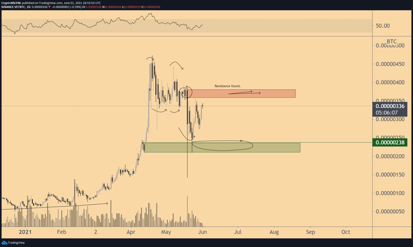 Trader kryptowalut @CryptoMichNL przedstawił wykres VET, stwierdzając, że główny obszar oporu wynosi 400 satoshi.