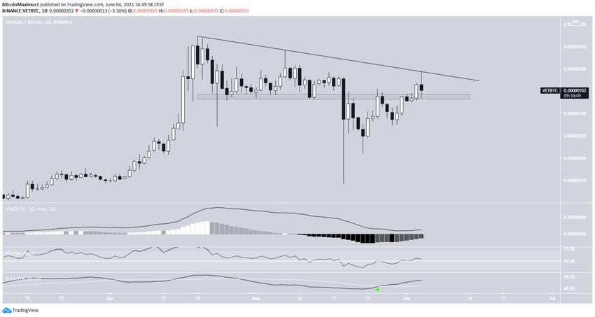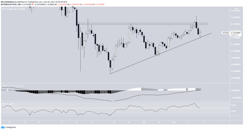 Krótszy wykres dwugodzinny zawiera również pewne sygnały bycze. Pokazuje rosnący trójkąt, który jest uważany za byczy wzór. Szczyt trójkąta to 0,14 USD. Jak dotąd VET dokonał trzech prób przełamania, ostatnią w dniu 4 czerwca.