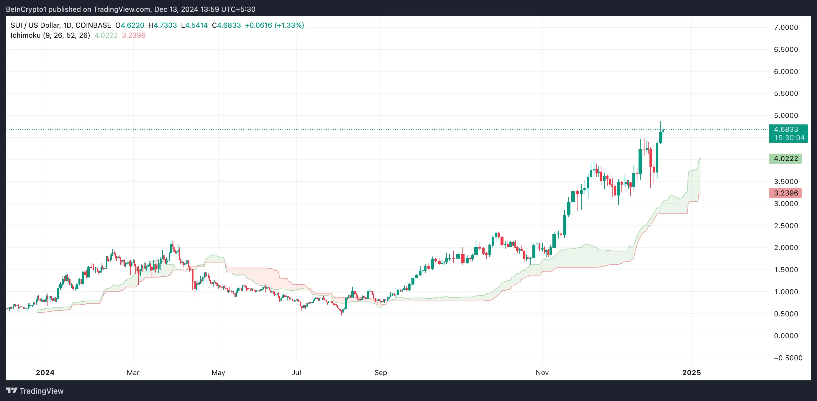 Jak oceniono na wykresie jednodniowym, ruch cenowy SUI pokazuje, że handluje powyżej swojej chmury Ichimoku. Ten wskaźnik śledzi momentum trendów rynkowych aktywów i identyfikuje potencjalne poziomy wsparcia/oporu.