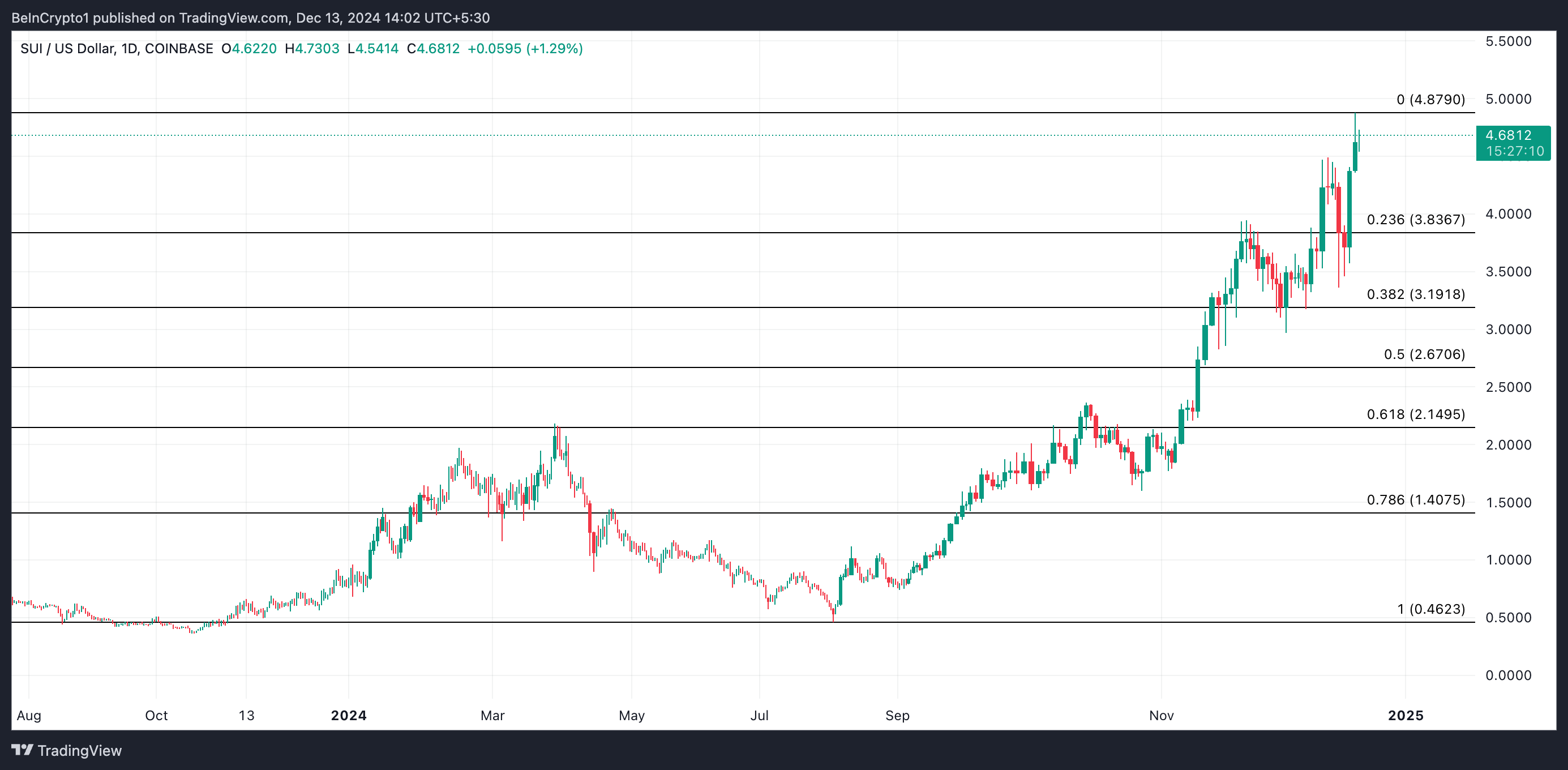 W ciągu ostatnich kilku dni SUI znajduje się na wzrostowej trajektorii, wywołanej przez rosnący popyt i silny optymizm inwestorów. Daje to nadzieje na wybicie SUI powyżej 5 USD w niedługim czasie. Podczas czwartkowej wczesnej sesji azjatyckiej, moneta warstwy 1 osiągnęła nowy rekord wszech czasów (ATH) na poziomie 4,87 USD.